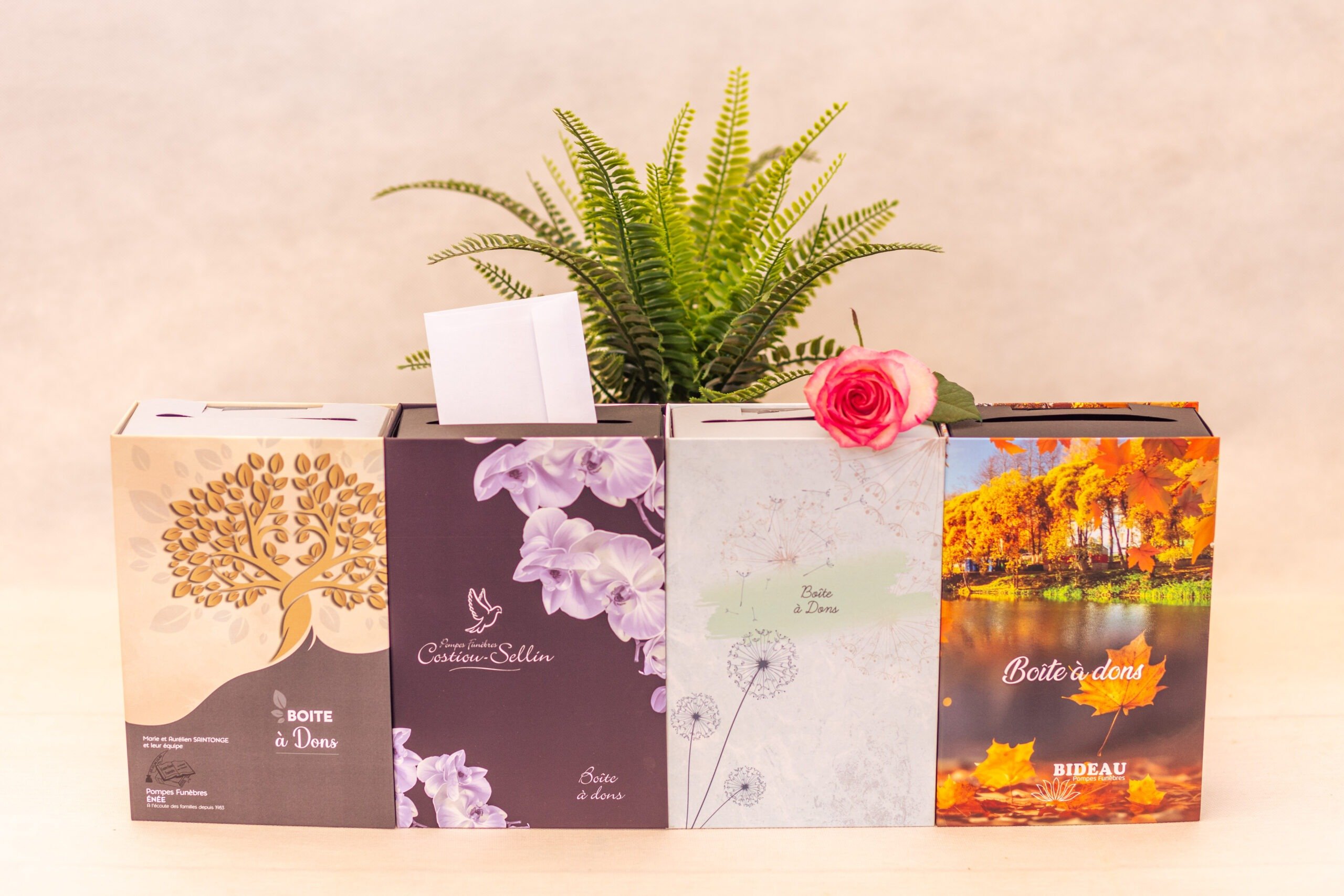 Conçues avec soin et discrétion, nos boîtes à dons allient esthétisme et sobriété. Personnalisables, elles s’intègrent harmonieusement au décor de la cérémonie, tout en rendant hommage aux valeurs et engagements du défunt. Ce dispositif, simple et efficace, favorise un élan de générosité collective en toute transparence. Offrez à vos proches la possibilité de faire un geste porteur d’espoir et de soutien, pour transformer la douleur de la perte en un acte de solidarité.