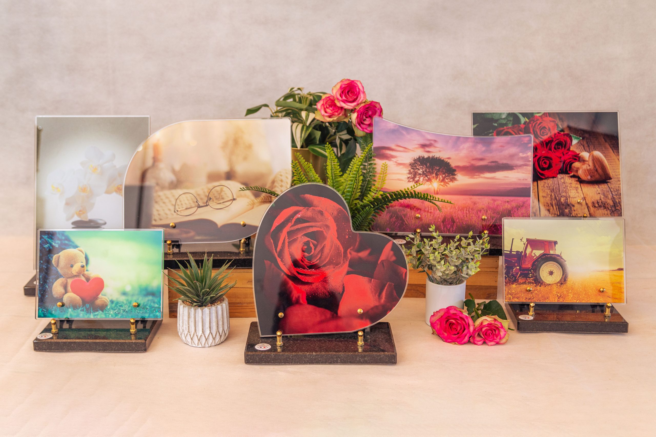 Conçues pour répondre aux envies de chacun, nos plaques funéraires en granit sont un élégant mélange de pierre traditionnelle et d’un altuglass imprimé pour faire revivre vos souvenirs les plus chers.