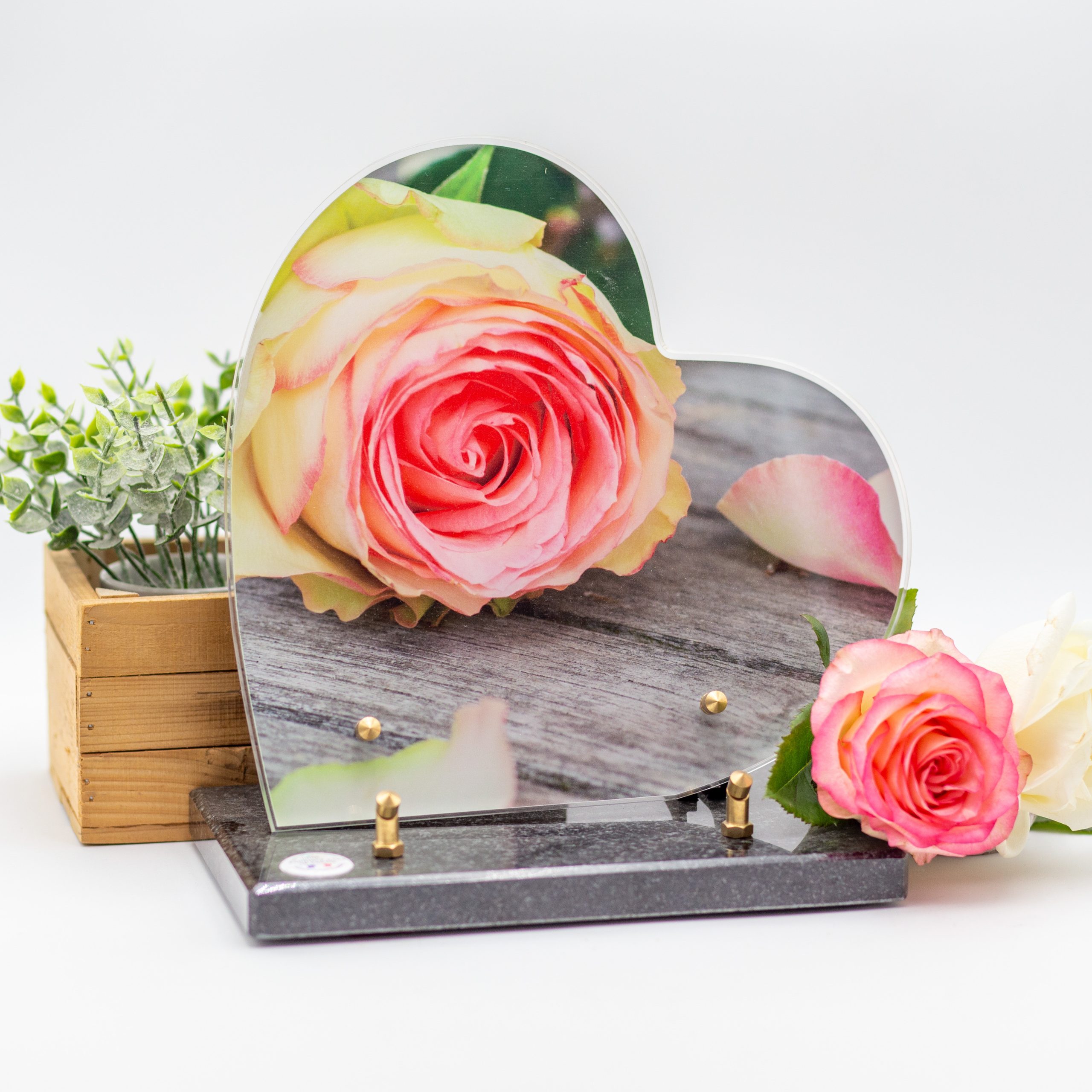Nos plaques funéraires en granit sont composées d‘un visuel imprimé sur Altuglass, et d’un socle en granit avec bords polis pour donner une forme douce et élégante au produit fini.