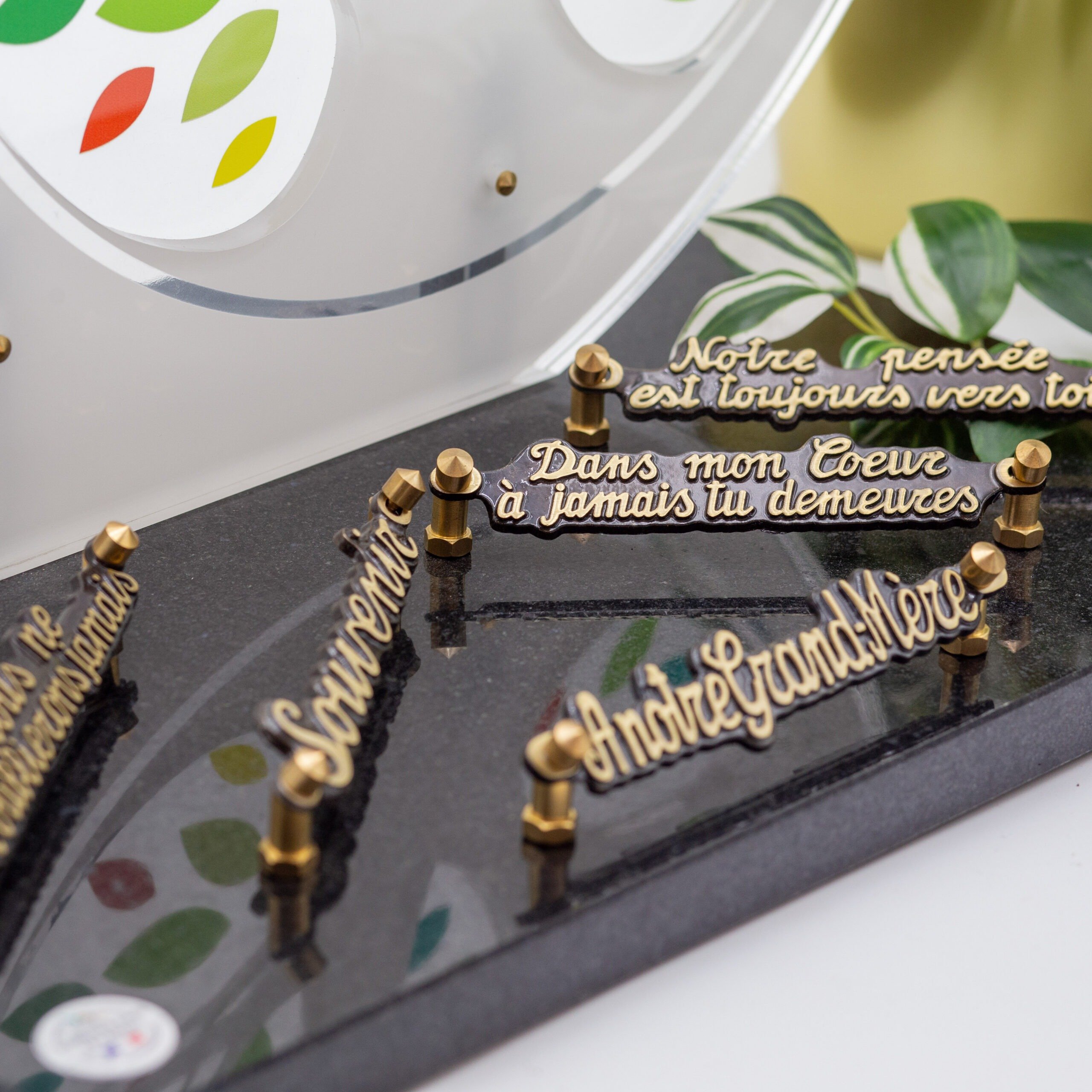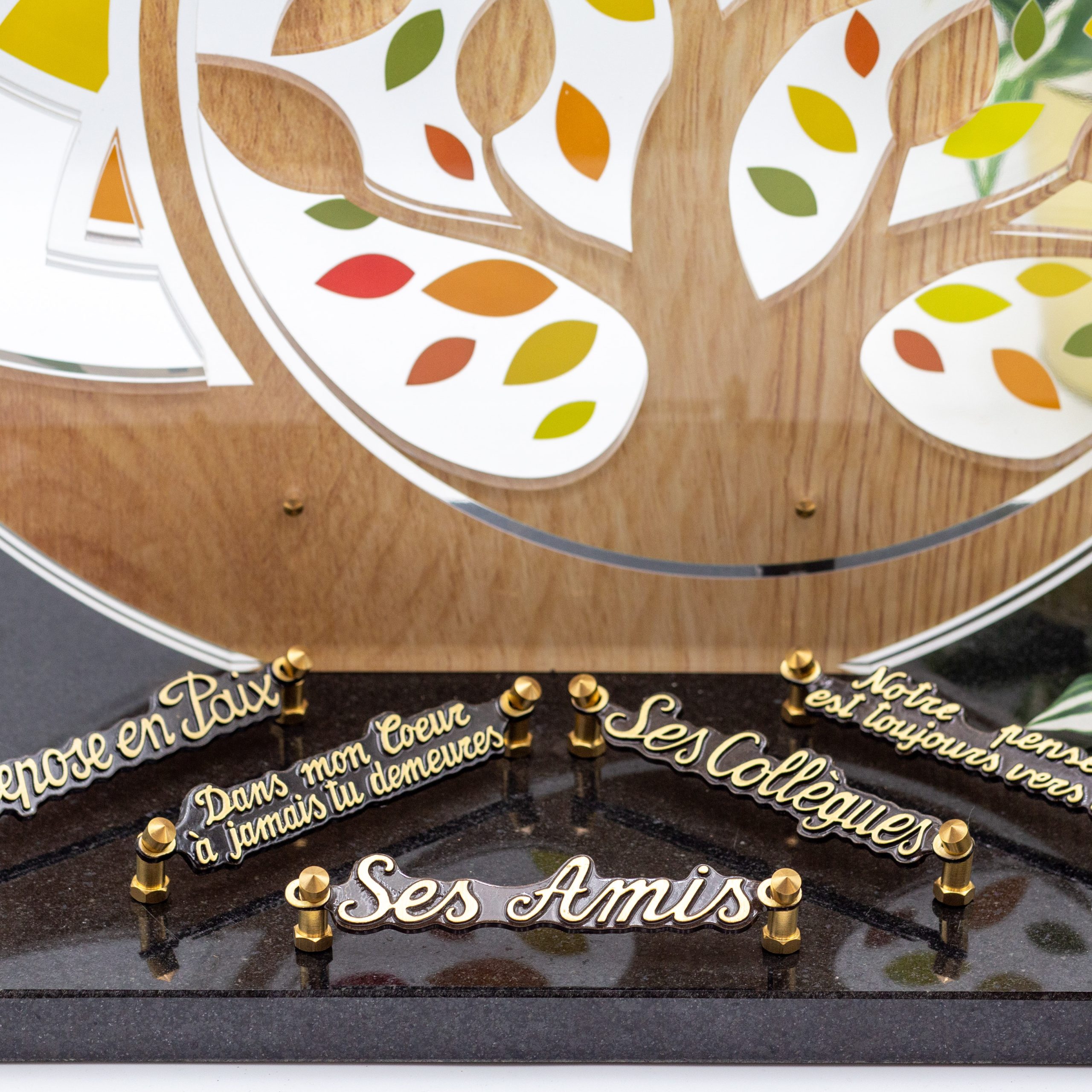 Ce Grand Arbre de Vie intègre également cinq inters personnalisables, permettant de graver des messages, prénoms ou citations, apportant une touche personnelle et unique à chaque plaque. Ce produit répond au besoin croissant de plaques funéraires modernes, originales et pleines de symbolisme, en rupture avec les designs classiques.