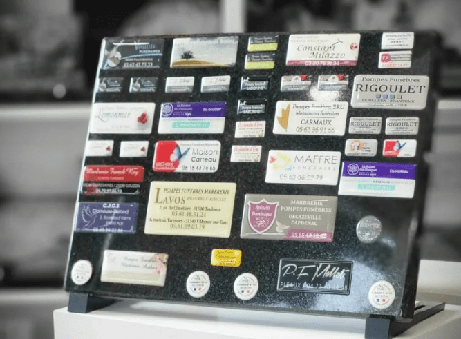 Conçue pour résister aux intempéries, elle tient dans le temps sans altérer l’harmonie du monument. Son design sobre s’adapte à toutes les créations. Chaque étiquette peut être entièrement personnalisée : nom, logo, coordonnées, QR code, typographie… tout est pensé pour refléter votre identité professionnelle.